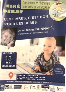 Dans le cadre de la manifestation "Un mois des histoires" organisée par l'Union Départementale des Associations Marie Bonnafé, psychiatre et psychanalyste, Présidente Honoraire d'A.C.C.E.S. anime une conférence suivante la projection du film produit par A.C.C.E.S. "Les livres c'est bon pour les bébés" le 13 mai 2022 à 20h00 à l'espace Ekklesia, Place du Docteur Ledos 61800 Tinchebray Bocage. L'entrée est libre.