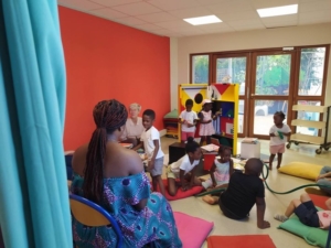Isabelle Sauer, lectrice d'A.C.C.E.S. présente La Raconterie aux bibliothécaires du département de Seine-et-Marne. Elle donne des pistes pour utiliser cette installation et rappelle pourquoi il est nécessaire de lire des livres aux tout-petits et de les aider à entrer dans la langue du récit. Atelier mis en place par la médiathèque départementale de Seine-et-Marne.